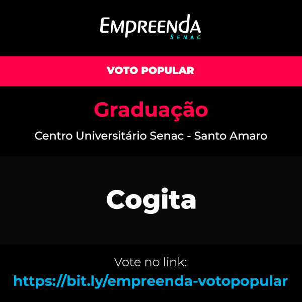 Equipe: Cogita Unidade: Centro Universitário Senac - Santo Amaro - EAD Integrante(s): Alicia Cristina Vieira Faria VOTAR NESTA EQUIPE E VOCÊ PODE TAMBÉM: - Copiar link da votação para compartilhar - Compartilhar imagem desta equipe na sua rede social favorita