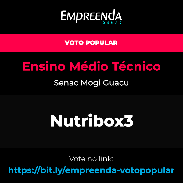 Equipe: Nutribox3 Unidade: Senac Mogi Guaçu Integrante(s): Lohany Victória de Jesus Augusto Silva ; Maria Vitória Silva dos Santos ; Yasmin Sturnichi Molinari VOTAR NESTA EQUIPE E VOCÊ PODE TAMBÉM: - Copiar link da votação para compartilhar - Compartilhar imagem desta equipe na sua rede social favorita