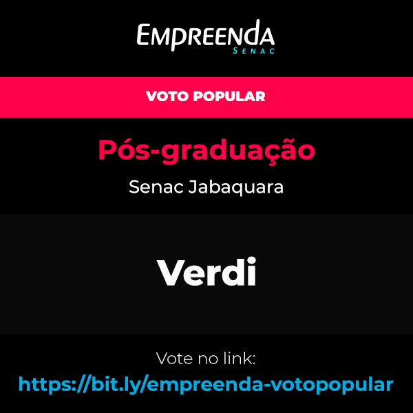 Equipe: Verdi Unidade: Senac Jabaquara Integrante(s): Jaqueline de Oliveira Silva VOTAR NESTA EQUIPE E VOCÊ PODE TAMBÉM: - Copiar link da votação para compartilhar - Compartilhar imagem desta equipe na sua rede social favorita