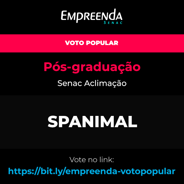 Equipe: SPANIMAL Unidade: Senac Aclimação Integrante(s): Júlio César Massola Nunes Marconi; Valquiria Midori Kawakami da Silva VOTAR NESTA EQUIPE E VOCÊ PODE TAMBÉM: - Copiar link da votação para compartilhar - Compartilhar imagem desta equipe na sua rede social favorita