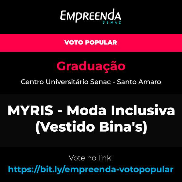 Equipe: MYRIS - Moda Inclusiva (Vestido Binas) Unidade: Centro Universitário Senac - Santo Amaro Integrante(s): Lucas Yukio Ono; Natália de Oliveira Santos; Paula Helena dos Reis Boy; Tamiris de Melo Silva VOTAR NESTA EQUIPE E VOCÊ PODE TAMBÉM: - Copiar link da votação para compartilhar - Compartilhar imagem desta equipe na sua rede social favorita